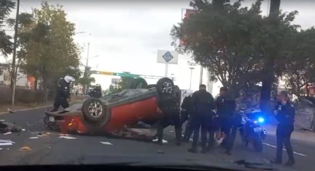 En su escape los presuntos delincuentes al circular frente a la Plaza Comercial Centro Max se volcaron y en ese momento los elementos policiacos los sacaron de la camioneta y los detuvieron.