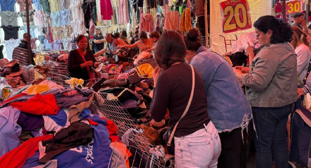 “¡Pásele, no se me duerma, aquí todo está de remate, hasta los calzones! ¡Llévese la prenda navideña!”, grita un vendedor encaramado en lo alto de una pila de ropa, atrayendo a los compradores con su energía contagiosa. La variedad es amplia: camisetas, sudaderas, pijamas, ropa deportiva, shorts, chalecos y ropa formal, con precios que oscilan entre los 20 a 100 pesos por prenda.