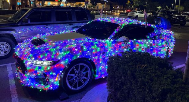 El vehículo, que asemejaba a un árbol de Navidad rodante, capturó de inmediato la atención de los transeúntes