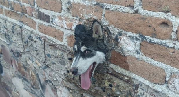 Un perro raza husky siberiano fue rescatado en la colonia Rivera de la presa, personal del cuerpo de bomberos acudió de inmediato a la vivienda en donde un perro quedó atorado, solo pudo sacar la cabeza de la tubería y quedó fuera de una barda de ladrillo.