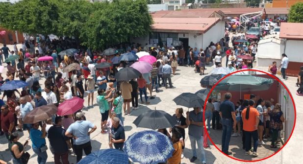 León.- Con sombrillas para el sol y abanicos, vecinos de Cerrito de Jerez llenaron la escuela Revolución Mexicana para acudir a votar.