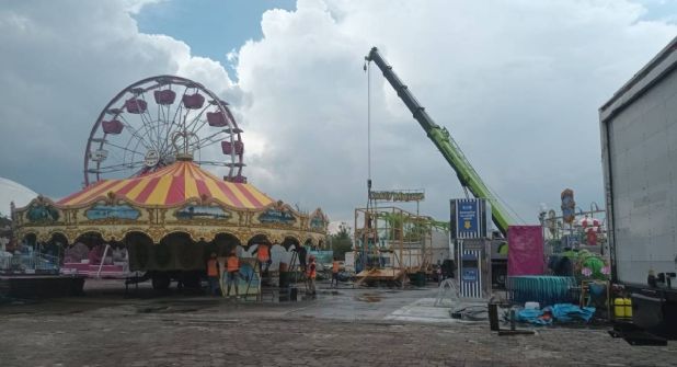 A pesar de la lluvia de este miércoles, decenas de trabajadores alistan incansables los juegos mecánicos y puestos que formarán parte del Festival de Verano 2024.