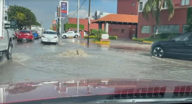 Conductores que circulan por la zona tienen que avanzar con lentitud debido a las calles inundadas tras las lluvias, para evitar quedarse atrapados.