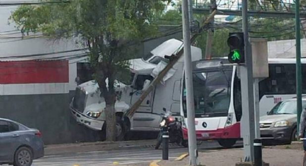 El incidente ocurrió en el bulevar mencionado casi esquina con la Oleoducto, en dirección al Timoteo Lozano, cuando el chofer del tráiler perdió el control y se impactó contra 2 postes, un árbol y la fachada de una bodega.
