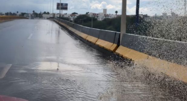 Al pasar por el puente los automóviles hunden sus llantas justo antes de pasar hacia la parte de arriba, el agua se acumula en la subida en dirección hacia el Parque Metropolitano de León, hacia Plaza Mayor.