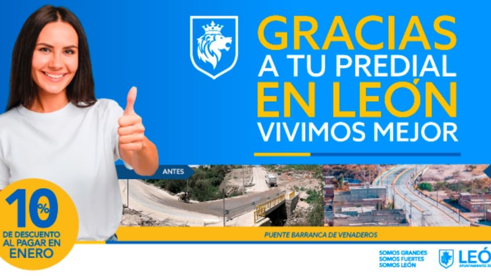 León, Guanajuato.- Este inicio de año, aprovecha los descuentos en la recaudación del impuesto predial. La Tesorería Municipal ofrece un descuento del 10% en el cobro del predial a todos los leoneses que realicen su pago en este mes de enero, y del 8% a quienes lo hagan en febrero.
