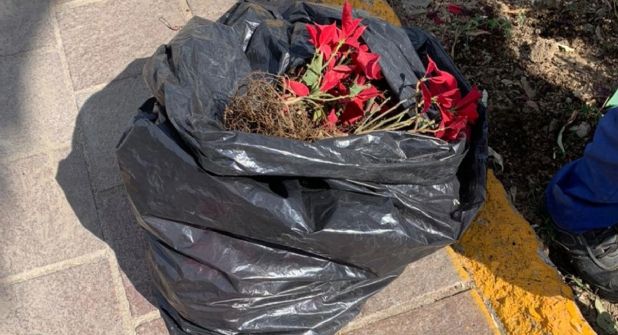 León-. Se terminó la época navideña y cientos de flores de nochebuena son sacrificadas extrayéndolas de las jardineras de donde fueron plantadas, después son tiradas a la basura como un desecho más, después de que en navidad adornan y embellecen los espacios públicos de la ciudad con sus tonalidades rojizas y blancas.