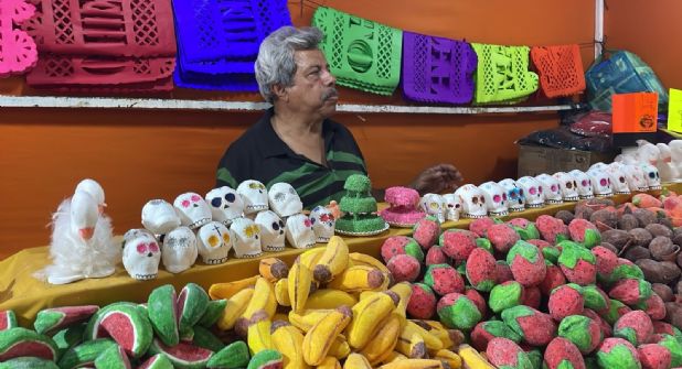 Don Pascual, vende los alfeñiques en el tradicional tianguis de la calle Leona Vicario, en la zona centro, de 9 de la mañana a 9 de la noche.