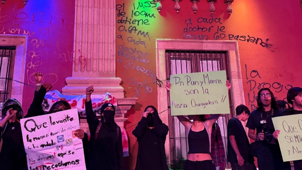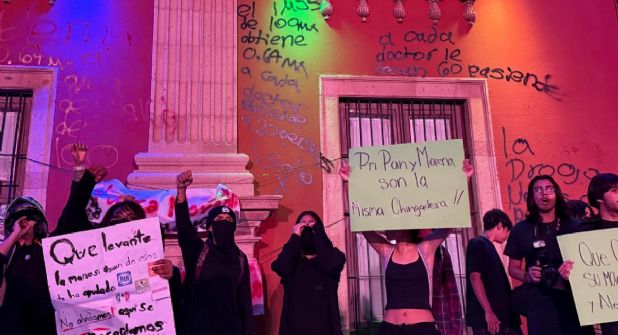 Una vez terminada la manifestación, llegó al lugar un grupo formado principalmente por mujeres vestidas de negro, quienes dieron rienda suelta a su postura anarquista y crítica radical, tapizando se grafitis la fachada de la Presidencia Municipal.