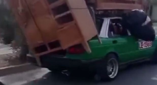 Se hizo viral el momento en el que un vehículo de pasajeros transitaba por una calle de León con un par de colchones en el techo, un ropero sujetado en la cajuela y en la ventana del copiloto una bolsa de ropa por fuera. El hecho llamó la atención de un motociclista que se arriesgó a grabar el taxi con toda una mudanza.