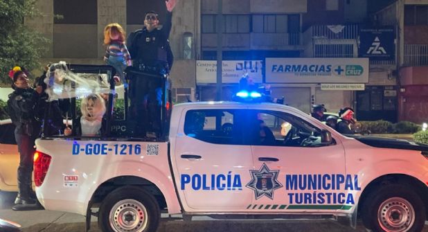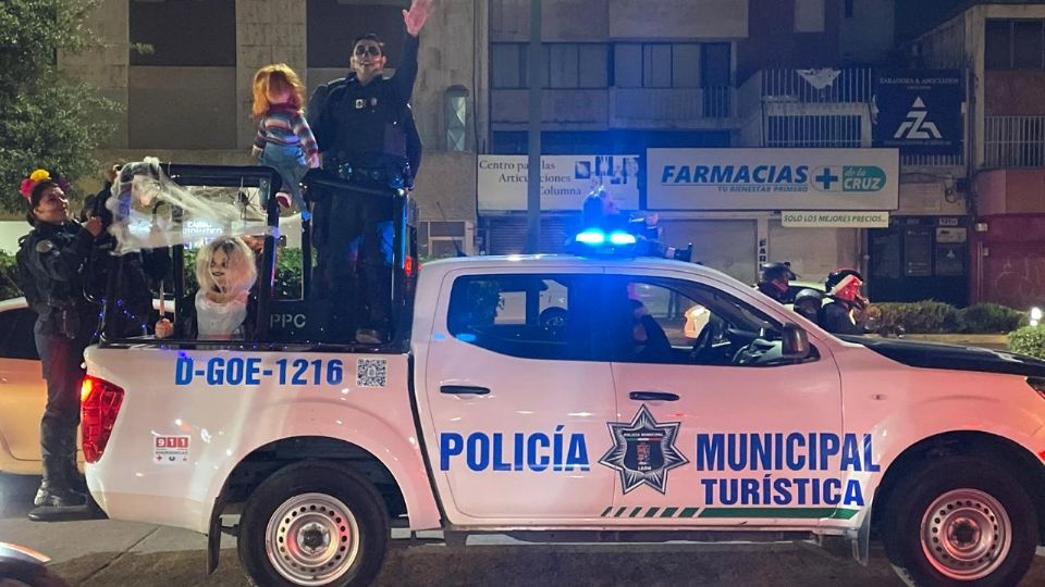 León, Guanajuato.- En León se treparon a las patrullas a Chucky y Tiffani para acompañar a los policías a repartir dulces por las Festividades del Día de Muertos.