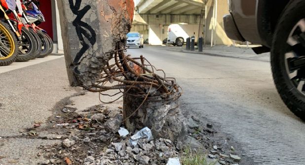 León-. Un poste de luz está a punto de caerse en el bulevar Mariano Escobedo, a la altura de la comandancia de Tránsito Municipal, la estructura que sostiene cables eléctrica está desecha, la impactaron desde hace semanas y tiene quince días en ese estado.