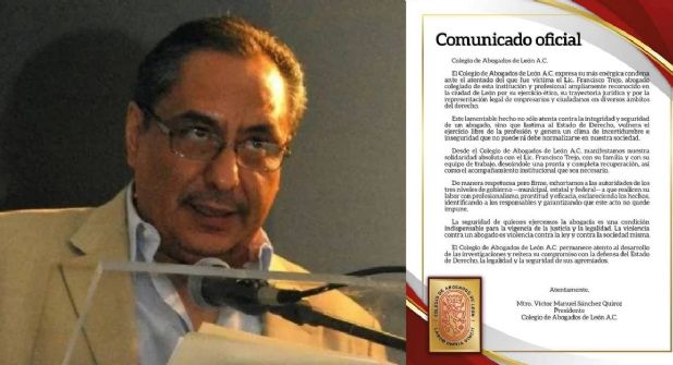 “El Colegio de Abogados de León A.C. expresa su más enérgica condena ante el atentado del que fue víctima el Lic. Francisco Trejo, abogado colegiado de esta institución y profesional ampliamente reconocido en la ciudad de León por su ejercicio ético, su trayectoria jurídica y por la representación legal de empresarios y ciudadanos en diversos ámbitos del derecho”, señala el comunicado.