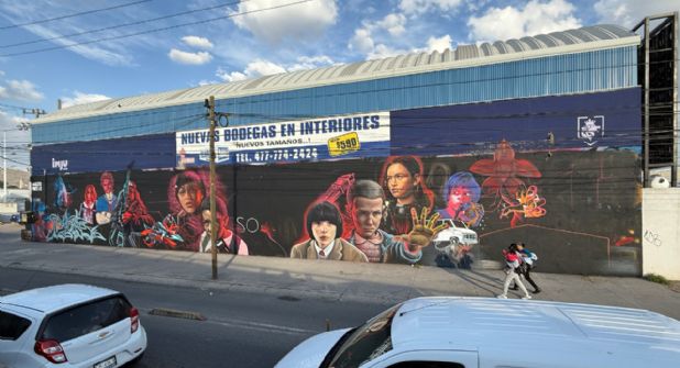 La Silla Rota Guanajuato realizó un recorrido y el mural, aunque aún no está terminado, ya muestra más del 70% de avance. Y sí, incluso en obra negra, se ve espectacular. La paleta es fuerte, contrastante; el estilo es lo suficientemente reconocible para que cualquiera que haya visto Stranger Things sienta ese tirón nostálgico de inmediato. Desde cualquier ángulo, incluso desde el retrovisor, el mural termina imponiéndose. Peatones que cruzan el bulevar se detienen unos segundos a mirarlo; los conductores, aunque no frenen, inevitablemente voltean.