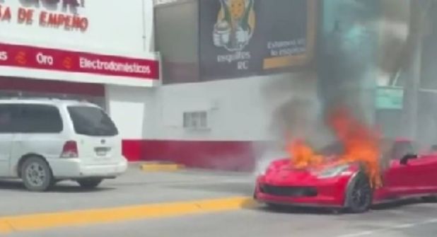 León.- Las imágenes son impactantes. El auto súper deportivo Corvette de color rojo comenzó a quemarse en el cofre, sin que el dueño pudiera evitarlo. En cuestión de minutos, el auto estaba casi completamente en llamas.