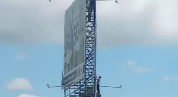 Estaban cambiando la lona de un espectacular de Telcel , sobre al menos 70 metros de altura, sin ningún tipo de protección, ni un lazo amarrado a la cintura, nomás la bendición de Dios.