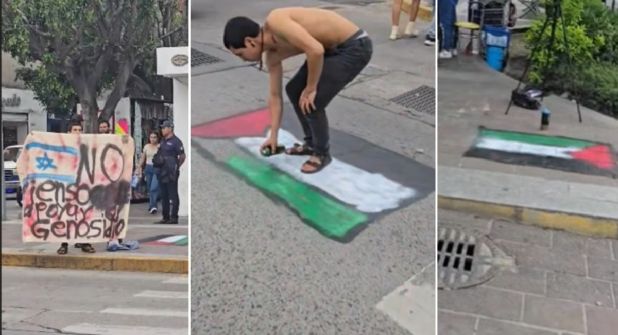 En un video difundido en redes sociales por el cibernauta Mario Alberto Mondragón, se observa al joven, en la esquina del bulevar Hermanos Aldama y calle 5 de Mayo, portando una manta grande donde aparece la bandera de Israel y el texto de: “No pienso apoyar el genosidio (Sic)”.