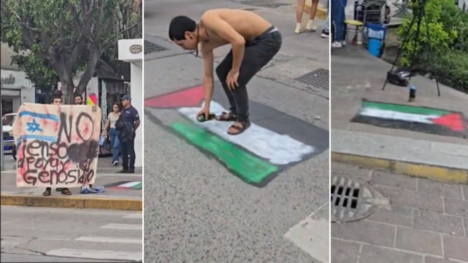 Una vez que el semáforo marcó el alto para los conductores que circulaban por López Mateos, el joven, con pintura de aerosol, terminó de pintar una bandera de Palestina sobre la vialidad, después de que ya había pintado otras dos banderas sobre la banqueta en esa misma esquina.