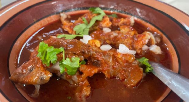 León, Guanajuato.- Enmoladas con chile guajillo o en caldo se pueden comer las tradicionales patitas de chivo del mercado de las Américas en León.