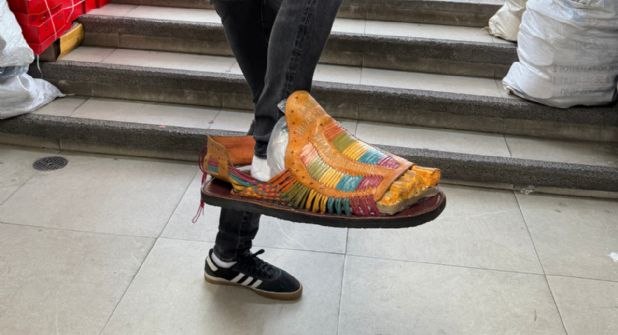 El interior del puesto parece un museo del cuero: huaraches de todos los colores, botas vaqueras, cintas, suelas, cajas. Una mezcla de caos y orden, como en todo taller tradicional. Pero el protagonista indiscutible es el huarache gigante, que también se puede calzar, aunque sea solo para la foto y el recuerdo.