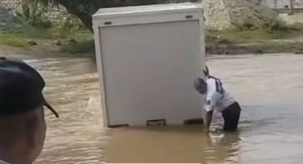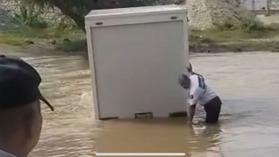 El conductor de una camioneta con caja de carga se quiso hacer el valiente e intentó cruzar el río que lleva una fuerte corriente de agua pero no la libró y su vehículo ya no dio.