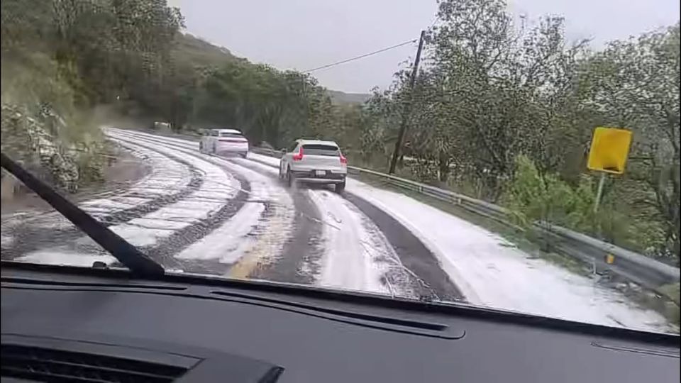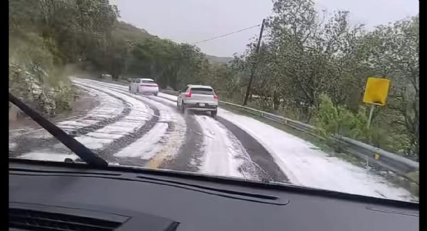 León, Guanajuato. - La tarde de este sábado, una lluvia con granizo sorprendió a los conductores de la carretera, en el tramo de Vergel de la Sierra, entronque Sierra de Lobos.