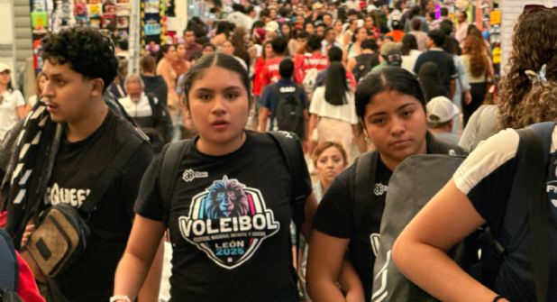 A donde mires, hay familias con maletas, jóvenes con mochilas deportivas, y decenas de adolescentes caminando en grupo con uniformes de voleibol. El ambiente tiene más acento del norte, del sur y del centro del país, que del bajío.