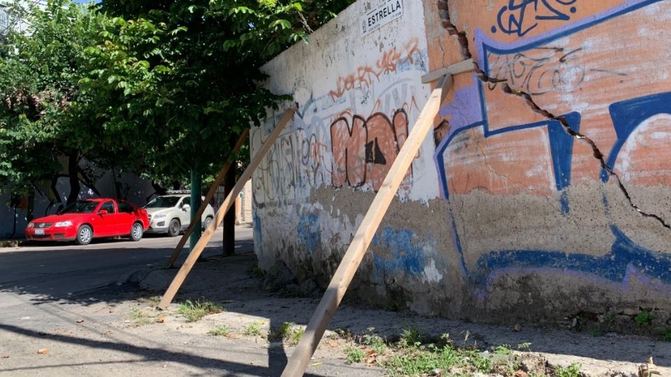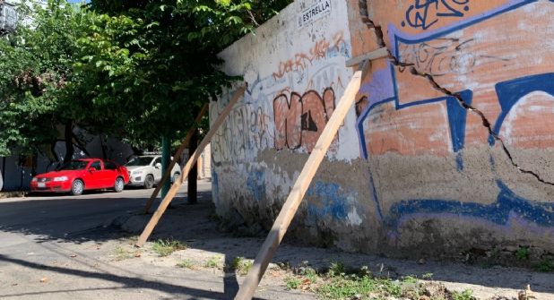 León-. La barda está a punto de caerse. Está inclinada sobre la esquina de las calles Calzada de Guadalupe y Estrella rumbo al Santuario de Guadalupe y Parque Hidalgo, solo tiene puestos unos polines. Nadie pasa por allí ante el temor de que se les caiga el muro encima. En esa condición ha estado el muro durante más de un año.