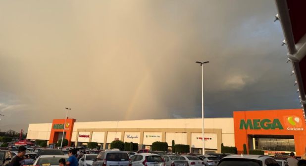 Desde Centro Max, el arcoíris lució sus mejores tonalidades, en medio de las nubes con varios tonos de grises que ya iniciaban a formarse.