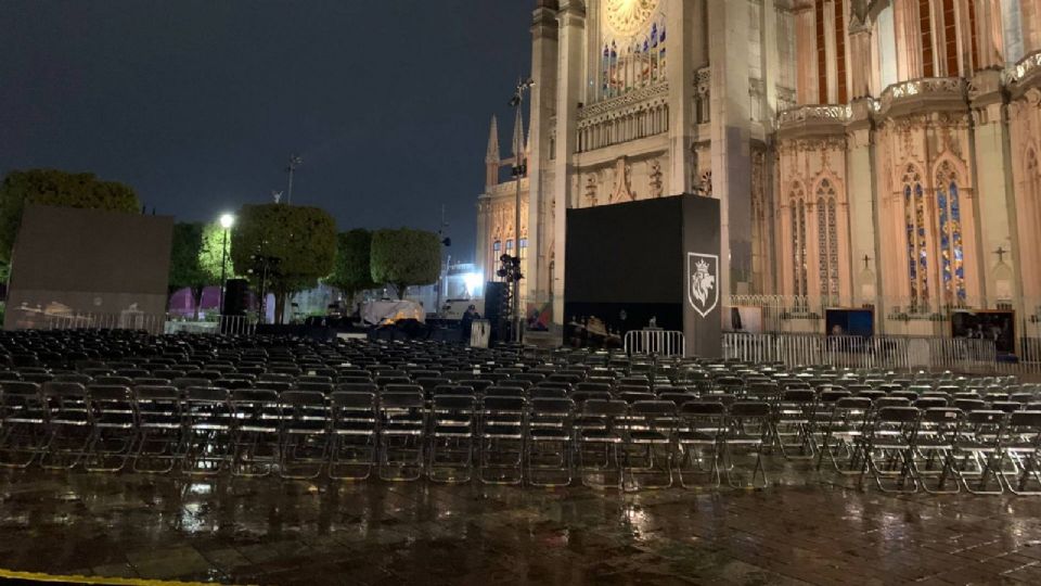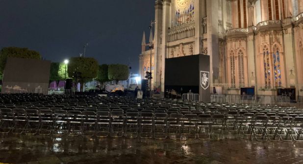 León.- Fue una tarde de lluviosa y uno de los festejos más grandes por el 450 aniversario de la Fundación de León se canceló. No hubo asistentes al pie del Templo Expiatorio, los asientos se quedaron vacíos y todo preparado.