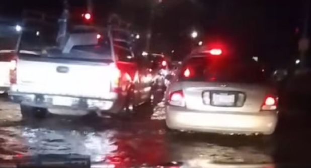 A través de redes sociales se compartió un vídeo en el que un conductor muestra como la zona en donde se abrió el boquete quedó completamente inundada ralentizando el trafico de la zona.