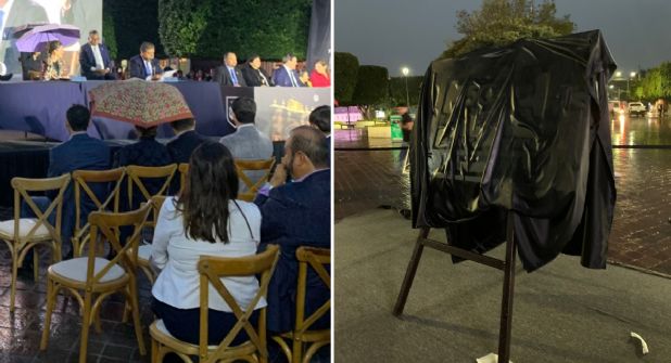 No se sabe cuándo será la develación de la placa, tampoco lo que tiene impreso, ni dónde será colocada, pues durante la Sesión Solemne del Ayuntamiento realizada el 20 de enero permaneció como un fantasma, cubierta con una tela delgada en color negro para protegerla de la lluvia, sobre un tripié de fierro, olvidada por los funcionarios, a quienes, posiblemente, ya les urgía protegerse del agua y el frío.