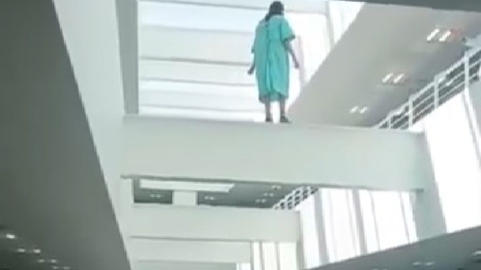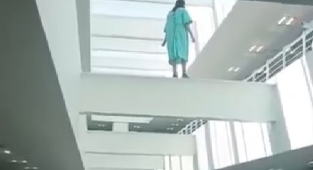 En el video fue captada la mujer, quien llevaba una bata médica azul y logró llegar a una estructura metálica dentro del hospital, a una altura considerable, donde amenazó con lanzarse.