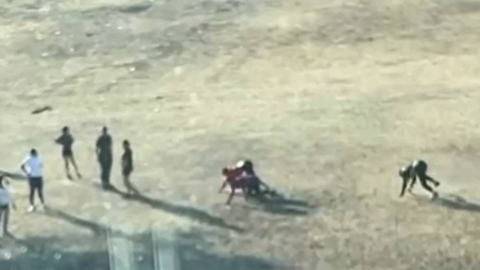 En el video se observa a un grupo de jóvenes que se encuentran en un campo de futbol del lugar y 4 de ellos “caminan” en sus pies y manos emulando ser animales.