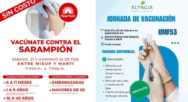 A través de sus redes sociales, las administraciones de ambas plazas dieron a conocer que este sábado y domingo estarán aplicando vacunas contra el sarampión de 11 de la mañana a 7 de la noche.