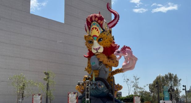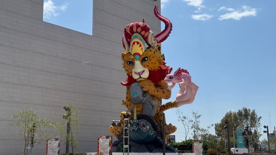 La obra, de más de 12 metros de altura, no es solo una figura llamativa: es una composición simbólica que reúne a seis especies en peligro de extinción en México —el jaguar, la guacamaya roja, la vaquita marina, el ajolote, la mariposa monarca y la tortuga laúd— formando una sola criatura híbrida.