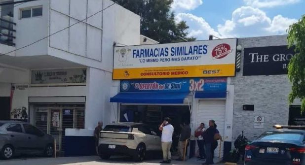 León, Guanajuato.- Un auto compacto se metió al interior de una farmacia Similares la tarde del miércoles Santo en la colonia Portones del Campestre.