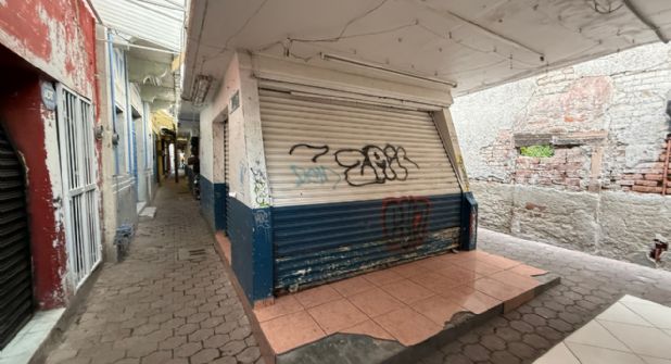 Apenas se cruza la entrada, el bullicio de la calle se apaga. Las cortinas de la mayoría de los locales están cerradas y cubiertas de grafiti. Las paredes están rayadas, las estructuras metálicas oxidadas, y el olor a orines se impregna en cada paso. Los letreros de advertencia no se limitan a ser amables: “Este lugar no es baño”, se lee en cartulinas fosforescentes, escritas a mano, amenazando con sanciones a quienes decidan usar los rincones como urinario público. El lugar, además, es refugio ocasional de personas en situación de calle.
