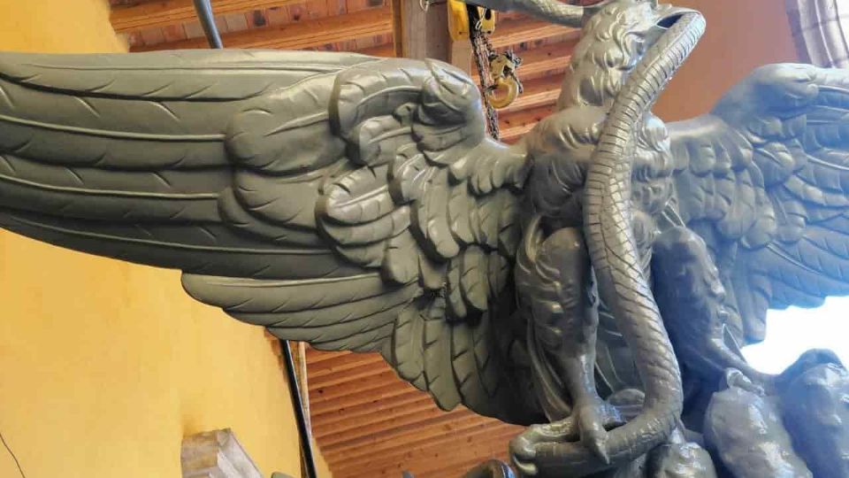 En relación a la escultura de bronce del águila con la serpiente, dijo que permanece bajo resguardo en Casa del Diezmo y lista para volver a ser colocada en su lugar cuando terminen los trabajos de restauración.