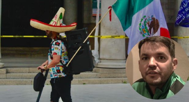 Al paso de Yahir el “Travieso”, autollamado el “hombre bocina” voltean a verlo quienes caminan cerca de él y a muchos les causa gracia y obviamente más a los connacionales que lo ven pasar y les recuerda a su México lindo y querido.