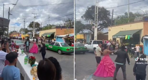 En ese momento, se ve en la grabación que pasa en la calle un taxi y la quinceañera y sus acompañantes luego de que se hicieran a un lado para dejar que pase al vehículo regresan a al centro de la vialidad a continuar el vals ante la mirada de familiares, amigos y vecinos.