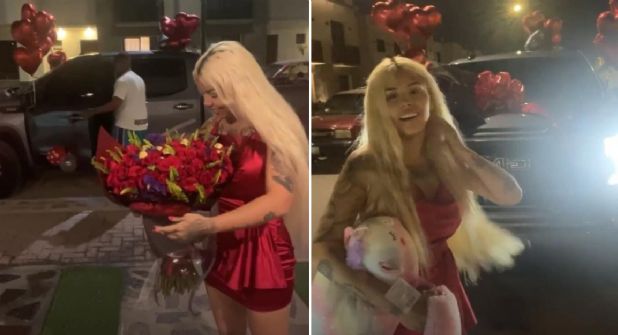 Geros llegó a bordo de una camioneta que estaba adornada con globos en forma de corazón, descendió del vehículo y le entregó a Mona un enorme ramo de flores y una pizza.