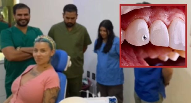 La influencer de León se puso 2 diamantes, uno en cada colmillo, “nada más para que se vea lindo y con el sol brille la sonrisa”, dijo mientras presumía su nueva imagen con una sonrisa de lado a lado frente a la cámara.