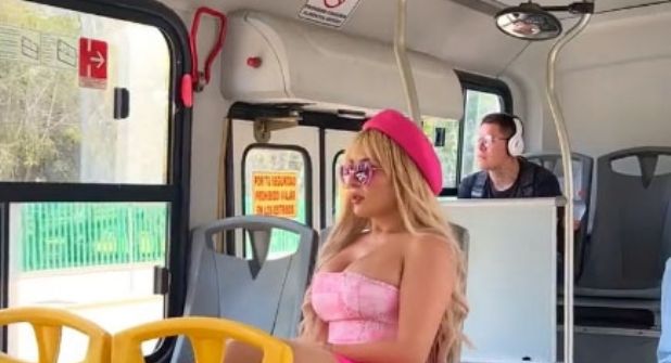 En las imágenes puede verse a una guapa joven personificada de Barbie con atuendo rosa y se ve como paseó por el transporte público de León, en un autobús articulado, mejor conocido como “oruga”.