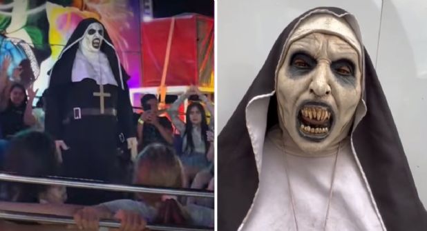 León.- Recientemente, se ha viralizado en redes sociales un video en donde se observa a una terrorífica “Monja” que baila en uno de los juegos mecánicos de la empresa Espectaculares García en la Feria de Torreón y lo que ha llamado la atención es que la persona que porta ese disfraz es guanajuatense.