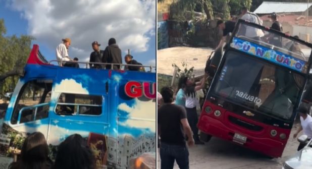 Guanajuato.- El rapero guanajuatense Ángel Jair Quesada Jasso, mejor conocido como Santa Fe Klan, se encontraba ayer en Guanajuato con motivo a que participaría este lunes por la noche en una fiesta eh honor a San Judas Tadeo, aunque horas antes decidió realizar un tour por la ciudad, ya que pensaba regalar dinero en el trayecto, sin embargo, cuando apenas empezaría el recorrido el camión Turibus de 2 pisos que había rentado le causó el susto de su vida.