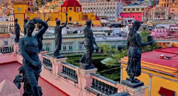 Dentro de los elementos más llamativos de este icónico edificio guanajuatense se encuentran nueve esculturas vaciadas en bronce con una altura de 3.5 metros de altura que simbolizan a las Musas Olímpicas.