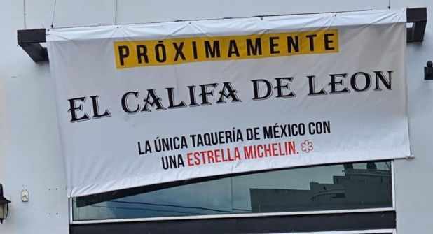 “Próximamente El Califa de Leon, la única taquería de México con una estrella Michelin”, se lee en la manta colocada en la puerta del local.