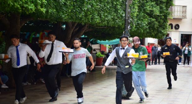 La carrera incluye dos modalidades: de velocidad y equilibrio, donde los meseros participantes demuestran su habilidad con charolas cargadas con bebidas preparadas.