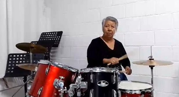 León-. En el año 2018 el esposo de Rosa María Pliego falleció y empezó a caer en una depresión que le producía sueño, que la aletargaba, hasta que un día sus hijos la llevaron para que tomara clases de cocina en la fundación MJT, después, tomó clases de piano, luego de batería. Recordó su pasión por la música recordando también que su marido siempre quiso ser músico. Ella ya domina la técnica y el ritmo.